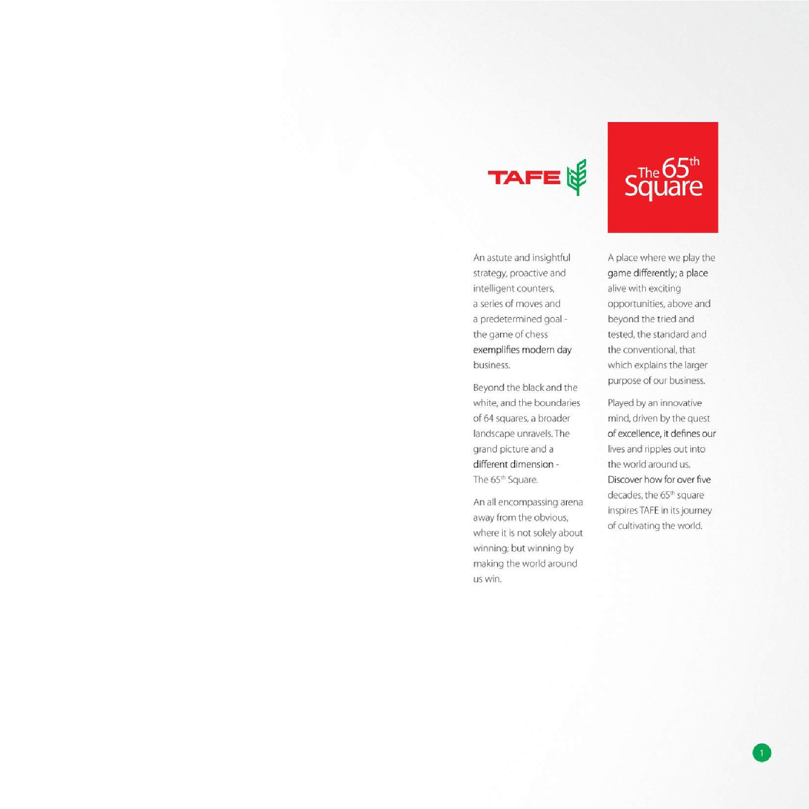 Played by an innovative mind, driven by the quest of excellence, it defines our lives and ripples out into the world around us. Discover how for over five decades, the 65th square inspires TAFE in its Journey of Cultivating the World